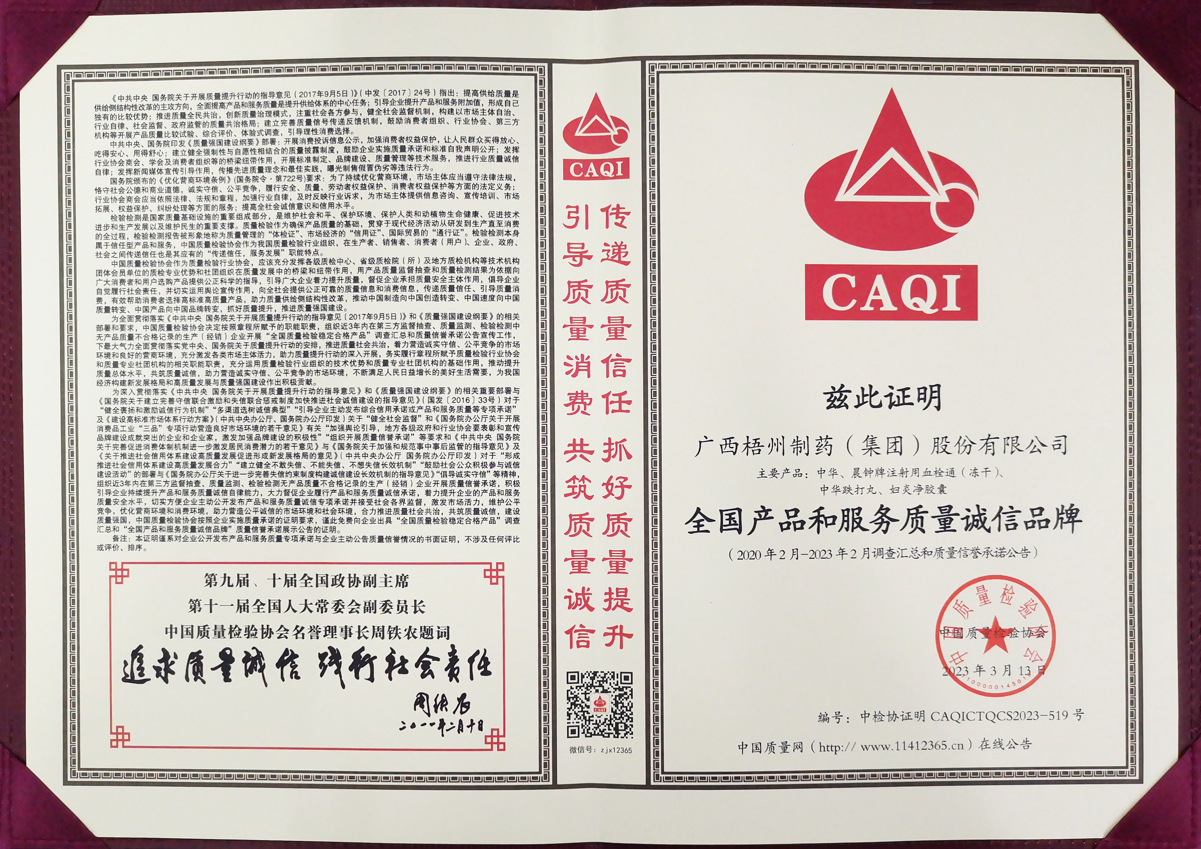 廣西梧州制藥(集團(tuán))股份有限公司榮獲2023年全國(guó)產(chǎn)品和服務(wù)質(zhì)量誠(chéng)信品牌