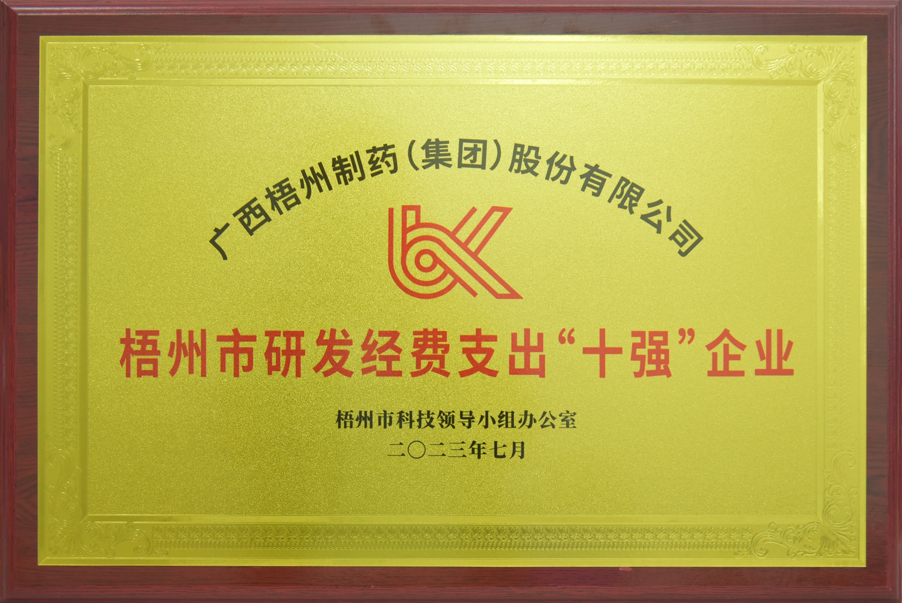 廣西梧州制藥(集團(tuán))股份有限公司獲評為梧州市研發(fā)經(jīng)費支出“十強(qiáng)”企業(yè)