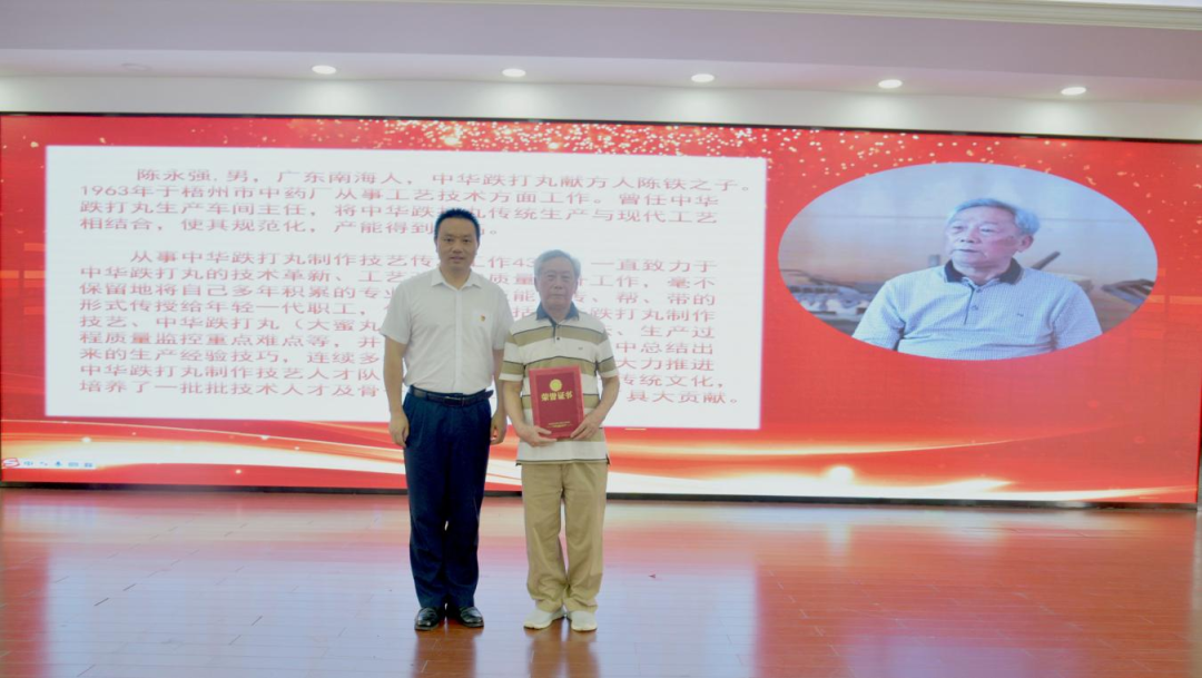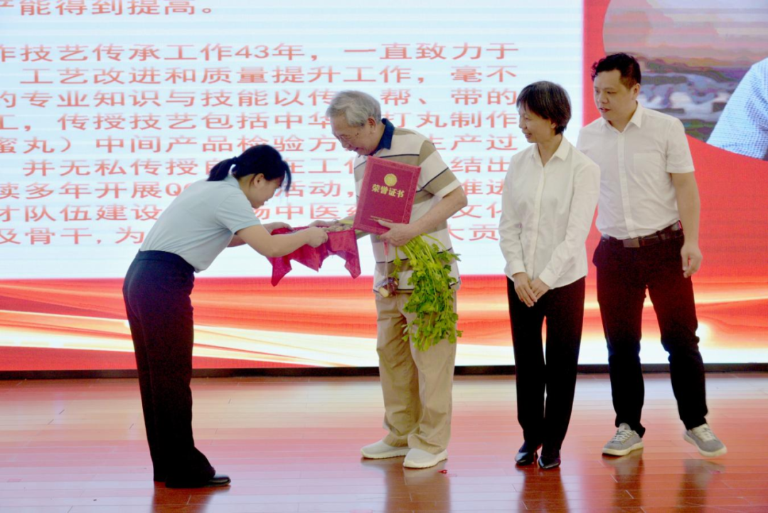 活動(dòng)還專門邀請(qǐng)了中華跌打丸獻(xiàn)方人陳鐵的兒子,現(xiàn)已83歲高齡的原跌打丸生產(chǎn)車間主任陳永強(qiáng)到會(huì),由公司黨委書記、董事長(zhǎng)黃文彩為其頒發(fā)“中華跌打丸制作技藝——金牌師父”榮譽(yù)稱號(hào)?!爸腥A跌打丸制作技藝”的第三、第四、第五代非遺傳承人依次上臺(tái),同樣用傳統(tǒng)的束脩六禮對(duì)陳老進(jìn)行了謝師,以此來(lái)表達(dá)對(duì)師父的感激之情、教導(dǎo)之恩。