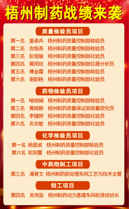 3金1銀3銅,梧州制藥45名職工在2024年梧州市職工職業(yè)技能大賽中秀絕活、展風采、創(chuàng)佳績。在角逐中藥炮制工、質量改進員、藥物檢驗員、化學檢驗員、維修電工、焊工、鉗工等7個項目比賽中創(chuàng)下歷史最佳成績。