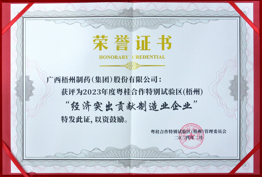梧州制藥獲評(píng)為2023年度粵桂合作特別試驗(yàn)區(qū)(梧州)經(jīng)濟(jì)突出貢獻(xiàn)制造業(yè)企業(yè)